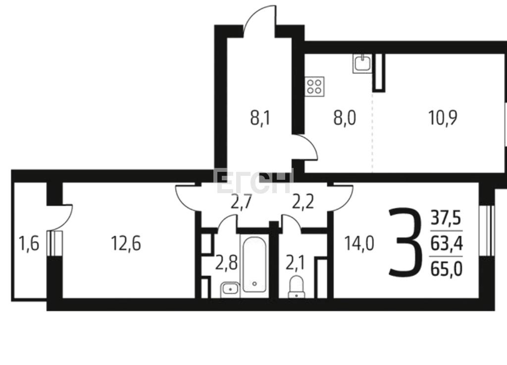 63.5 м2 общая37.5 м2 жилая8 м2 кухня