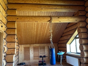 • Построена из бруса 150х150 мм внутренние перегородки — из бруса 100х100 мм.