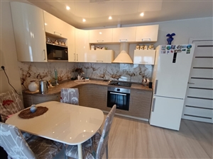 Светлая совмещённая с кухней гостиная располагает элегантной мягкой мебелью и TV. В кухонной зоне расположен качественный удобный гарнитур со встроенной техникой. Вся необходимая бытовая техника в наличии: